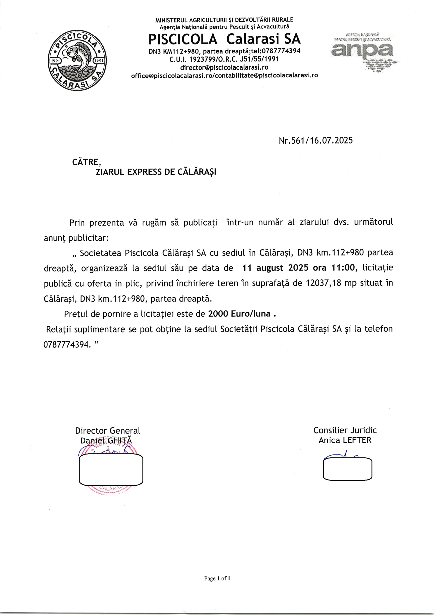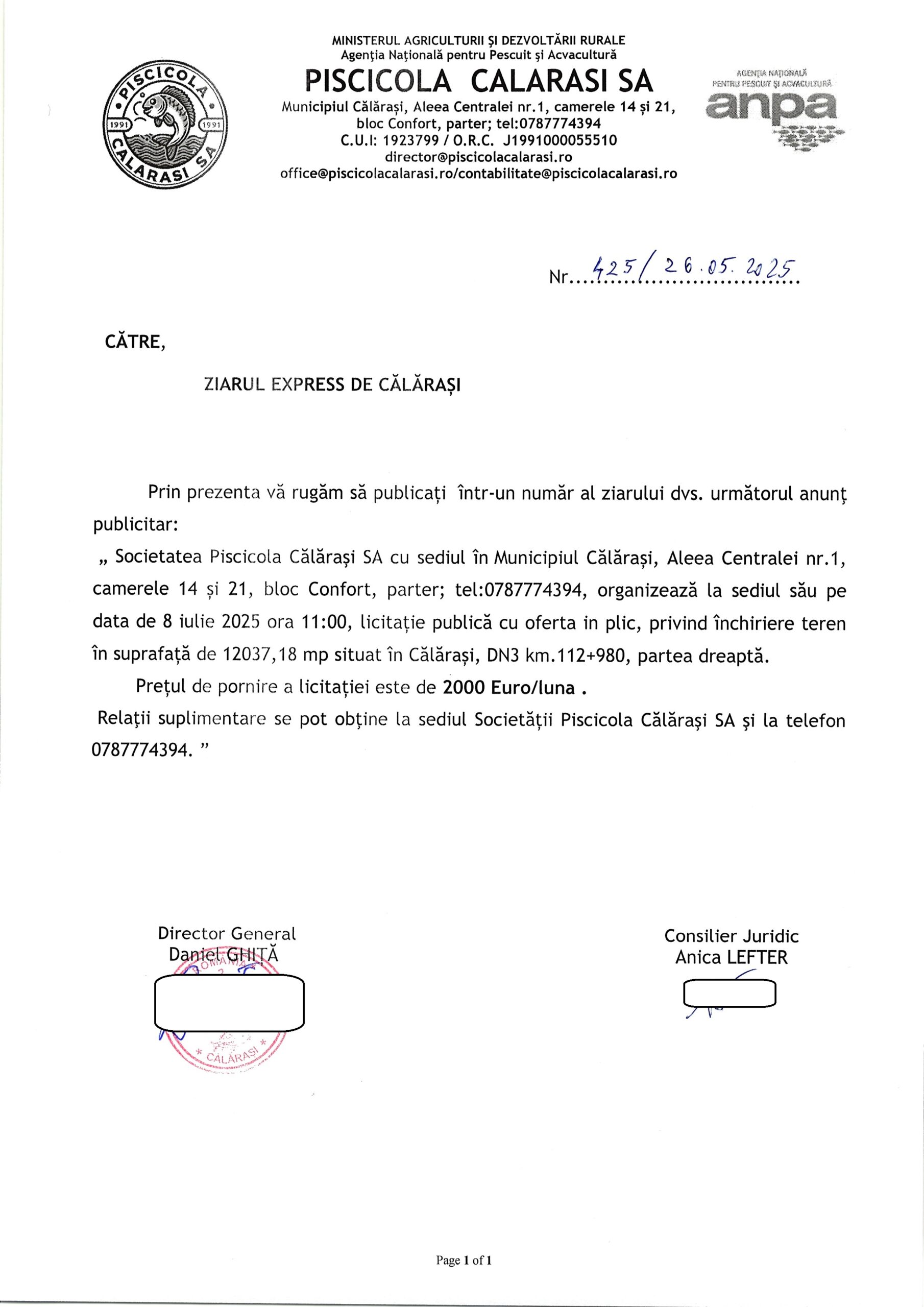 - Anunț privind selecția candidaților pentru poziția de membru al Consiliului de Administrație al Societatii PISCICOLA S.A Calarasi